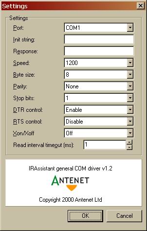 Um die Fernbedienung des PCs zu ermöglichen benötigen sie das Programm IRAssistant und den dazugehörigen General Com Driver, die beide zum kostenlosen download unter:: http://www.irassistant.com zur Verfügung stehen. Um Das Programm und den General Com Driver zu installieren, folgen sie bitte der jeweiligen Anleitung. Nach dem Starten des IRAssistant und auswählen des Punktes Settings im Menü File sehen sie folgendes Bild:
