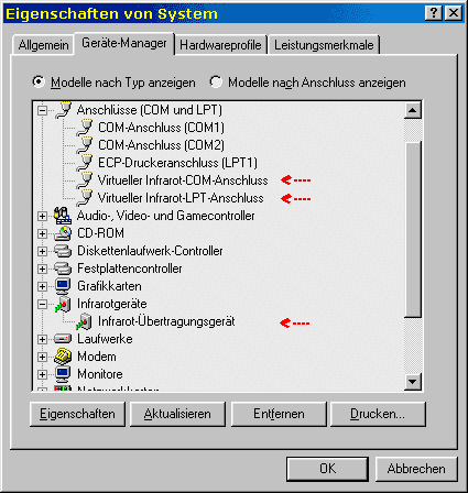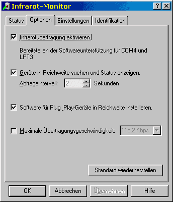Der erste Punkt hier (Infrarotübertragung aktivieren) ist nur bei Win98 in dieser Form vorhanden. Bei Win95 kann man hier zusätzlich den COM-Port des Infrarotports einstellen. So! Die grundsätzliche Installation ist erledigt. Autor: Holger Janssen