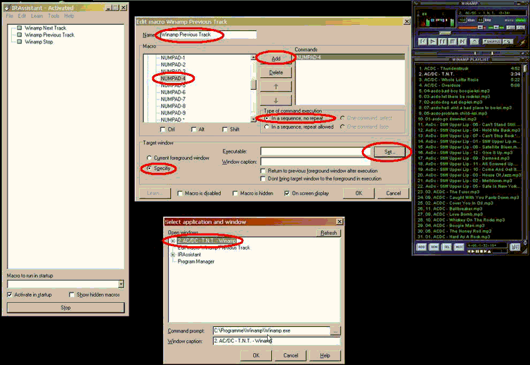 Passen sie auch hier alle Werte denen im Bild an. Das war der erste Schritt. Jetzt müssen sie dem IRAssistant nur noch mit den Signalen Ihrer Fernbedienung füttern, und denen die jeweilige "Aktion" zuordnen. Wählen sie dazu im Menü Edit den Punkt Add general macro... aus. Geben sie als erstes der Action einen Namen, z.B. "Winamp Previous Track" (siehe Bild). Als nächstes müssen sie auswählen, welche Action der IRAssistant simuliert, wenn das entsprechende Signal von der Fernbedienung (dieses wird später noch eingelesen) empfangen wird. In diesem Fall, um beim Winamp zum vorigen Lied zu wechseln, ist es einfach nur die Taste 4 auf dem Ziffernblock. Dies stellen sie ein, indem sie die Taste Numpad-4 unter dem überpunkt Keys anwählen und danach auf Add klicken (siehe Bild). Als nächstes wählen sie die Option Specify aus und wählen hier als Programm Winamp aus, der nach Anklicken von Set... zur Auswahl steht, sofern er gerade aktiv ist. Sollte Winamp nicht laufen, und somit auch nicht aufgeführt werden, starten sie ihn, klicken auf auf Refresh und wählen ihn dann aus. Dies ist nötig, damit der Druck der Taste 4 auf dem Ziffernblock auch dem richtigen Programm zugeordnet wird. So verfahren sie mit allen Funktionen, die sie im Folgenden mit einer Taste auf ihrer Fernbedienung verknüpfen wollen. Lediglich bei Tasten, die nicht einmalig gedrückt werden, sondern unter umständen auch für längere Zeit gehalten werden, wählen sie den Punkt In a sequence, repeat allowed aus (Ein Beispiel für eine solche Taste: Vorspulen).