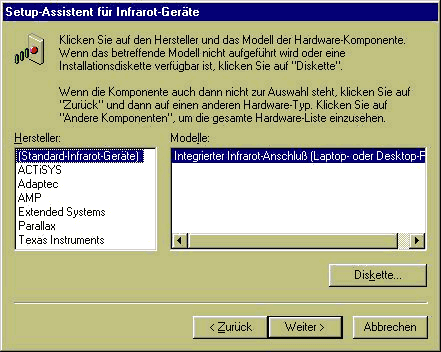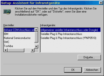 Der erste Punkt hier (Infrarotübertragung aktivieren) ist nur bei Win98 in dieser Form vorhanden. Bei Win95 kann man hier zusätzlich den COM-Port des Infrarotports einstellen. So! Die grundsätzliche Installation ist erledigt. Autor: Holger Janssen